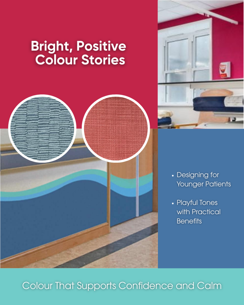 In healthcare environments, softer tones such as blues and greens are often used to promote calmness and reassurance. In education or leisure settings, brighter colours can introduce energy and support brand identity. Murals and graphic elements can also be used to create interest, support wayfinding or provide distraction in environments such as paediatric healthcare settings.